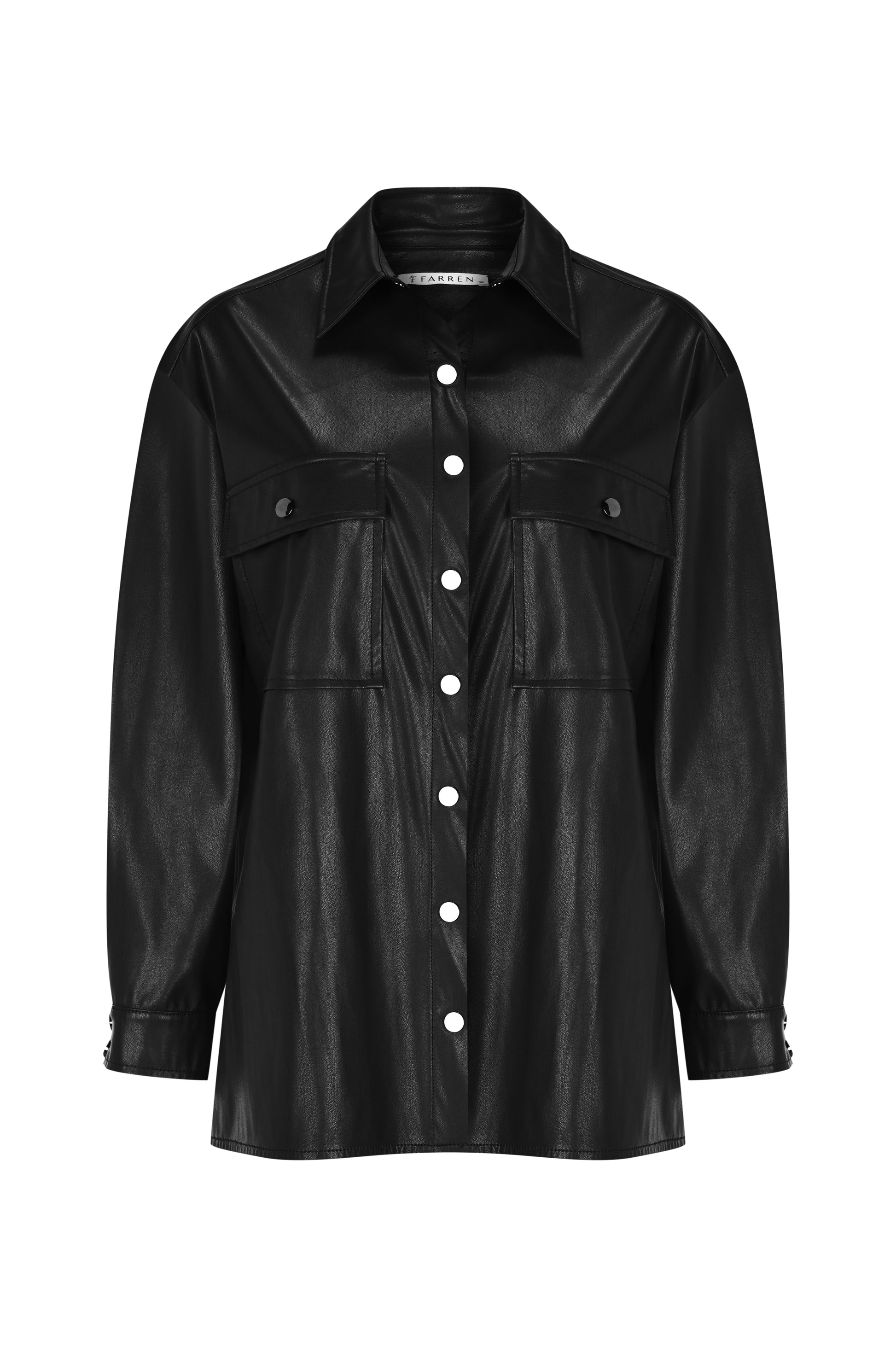 FRN LINE – Black Faux Leather Button-Up Shirt for Women FRN6108