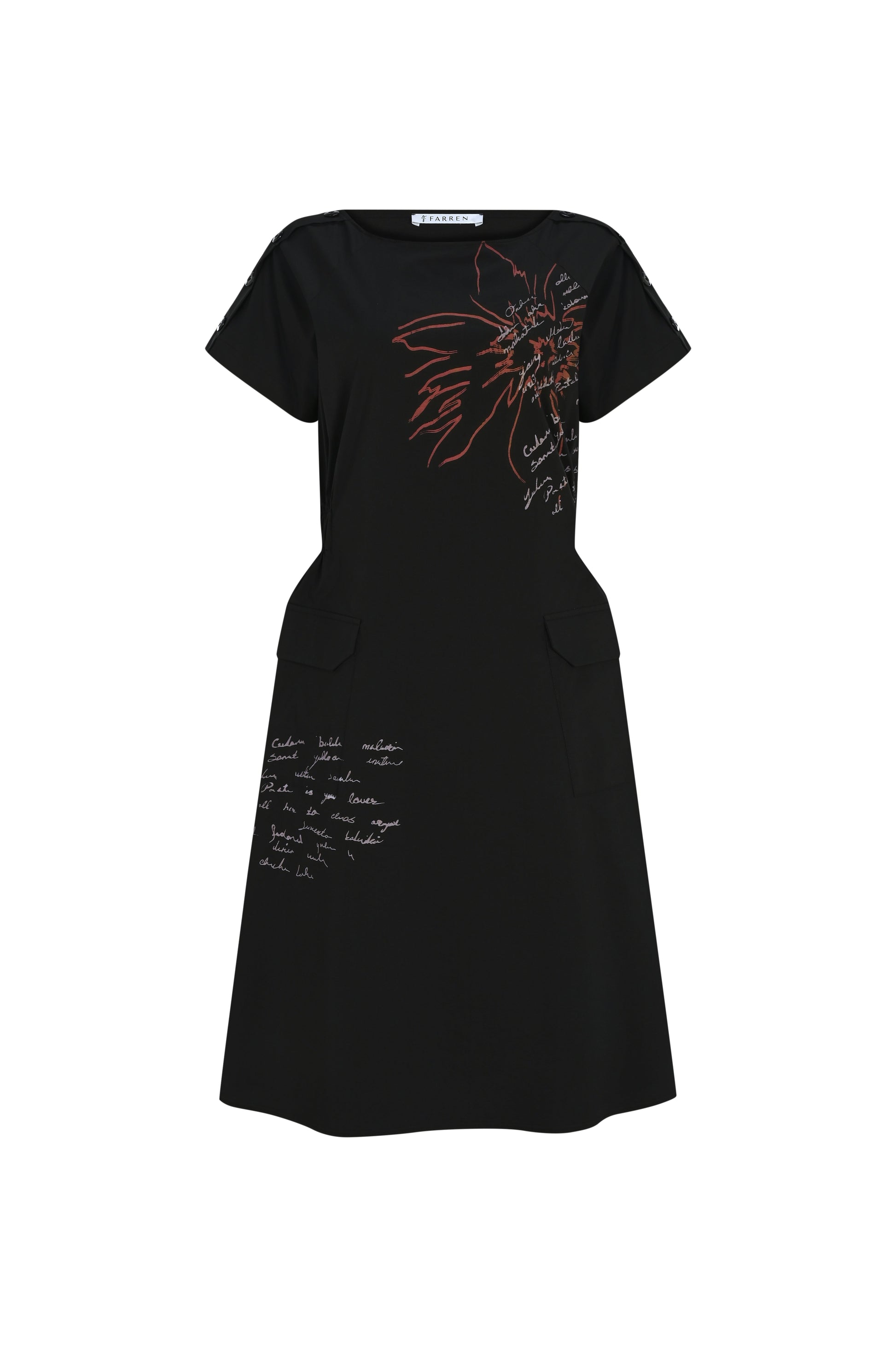 This short-sleeved midi dress features a unique floral and handwritten script print across the front, giving it an artistic and expressive appeal. Designed with a relaxed, slightly A-line silhouette, it includes dual front flap pockets for both functionality and casual charm. The round neckline and clean-cut sleeves offer a minimalist touch, while shoulder button details subtly enhance the overall design. Perfect for everyday wear with a creative twist, this dress is an effortless statement piece for modern wardrobes.