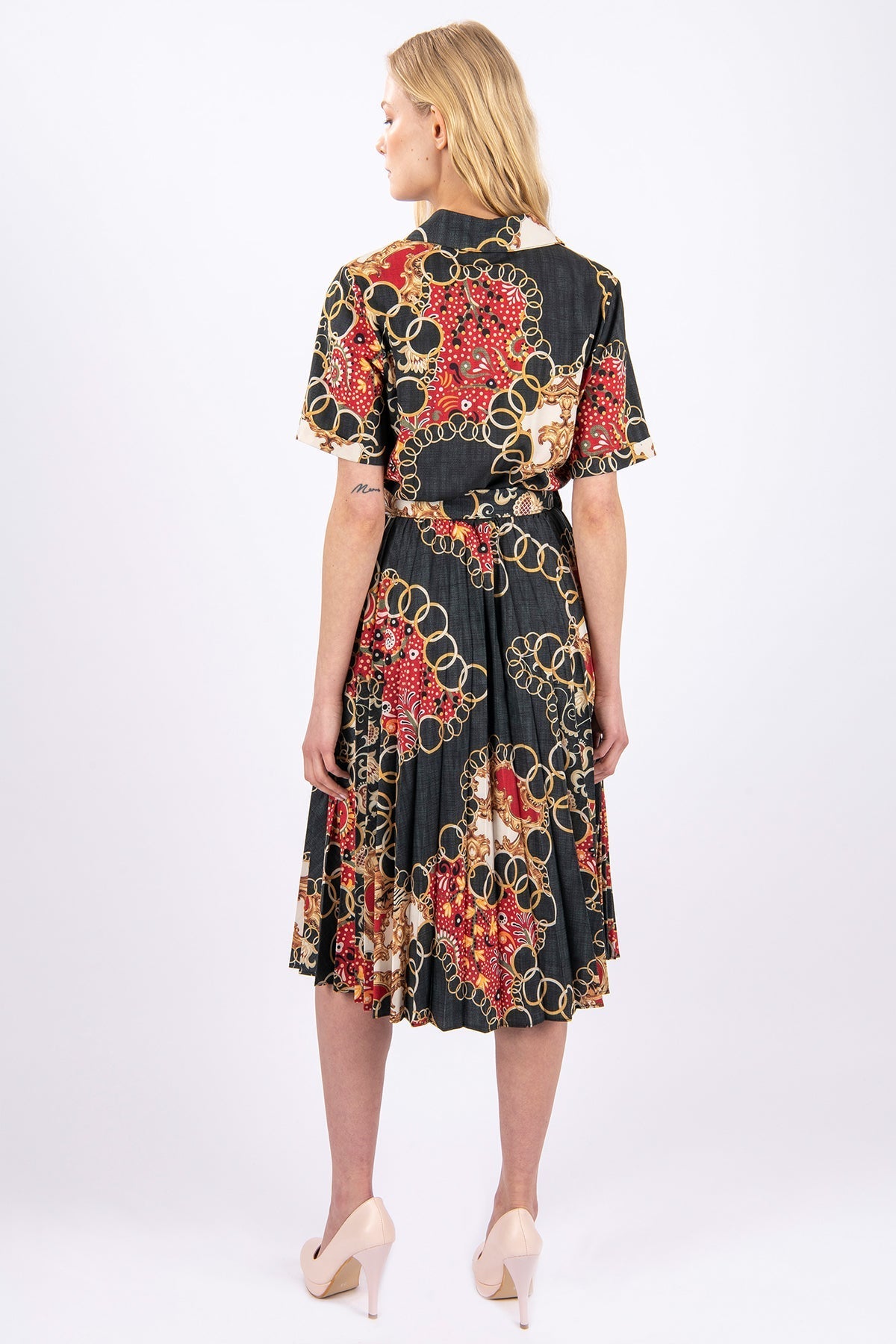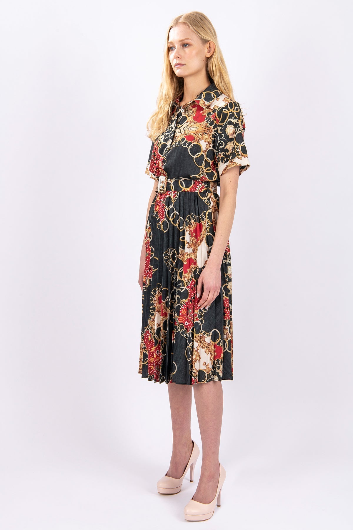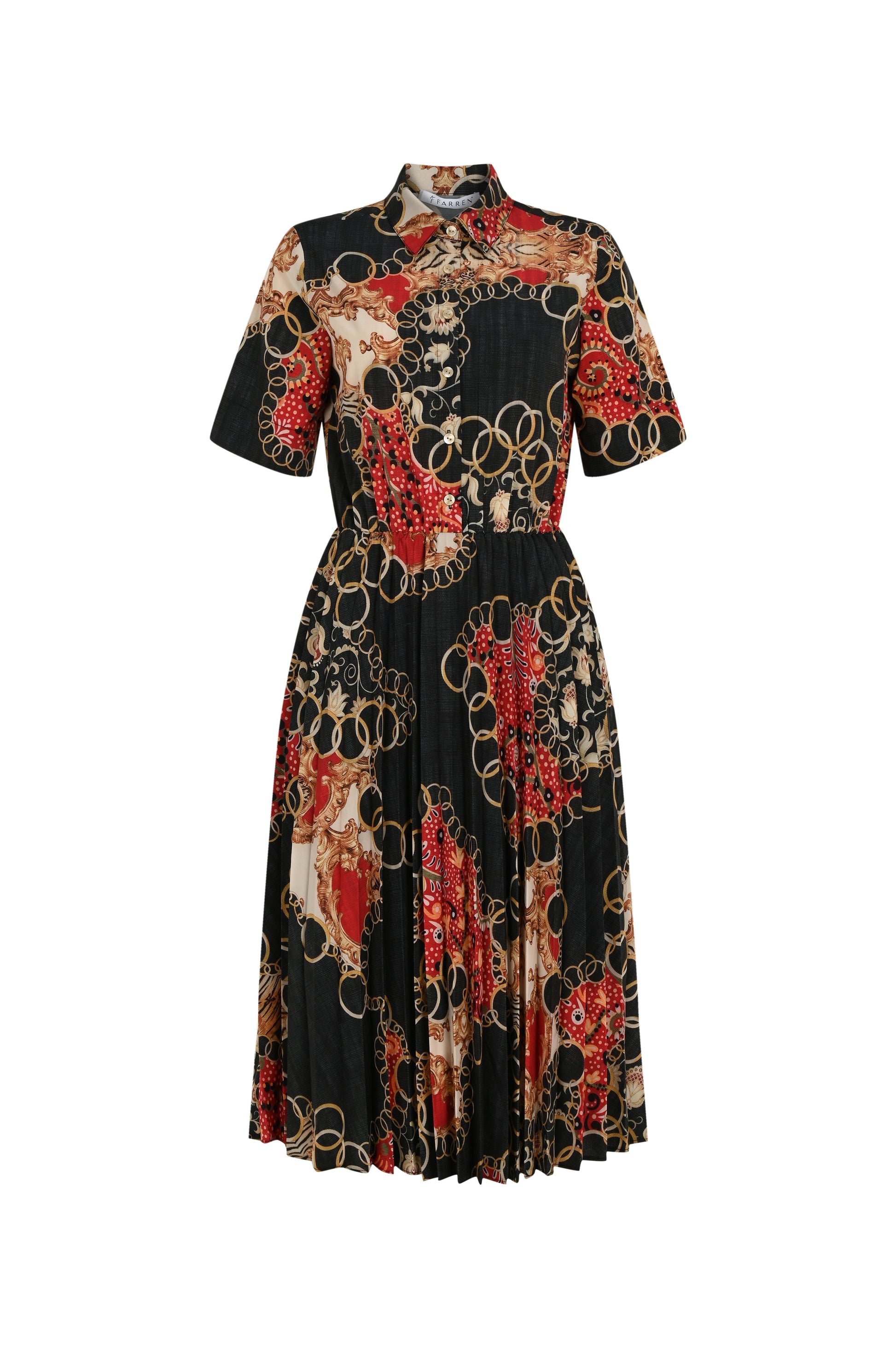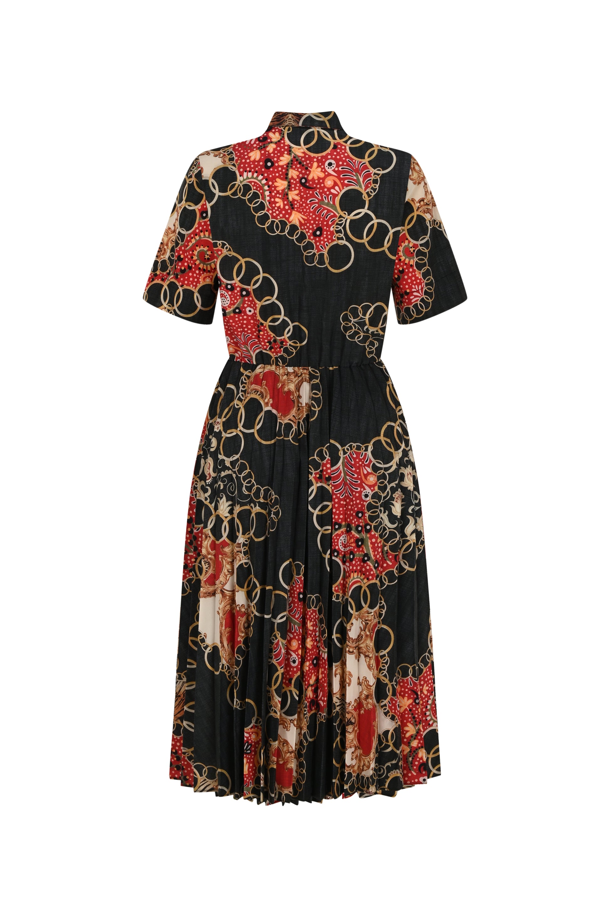 Crafted in a baroque-style chain and scarf motif, this pleated shirt dress offers a polished yet expressive look. The short sleeves, sharp collar, and waist-defining belt bring structure, while the flowing pleated skirt offers fluidity. A standout option for both daytime sophistication and evening flair.
