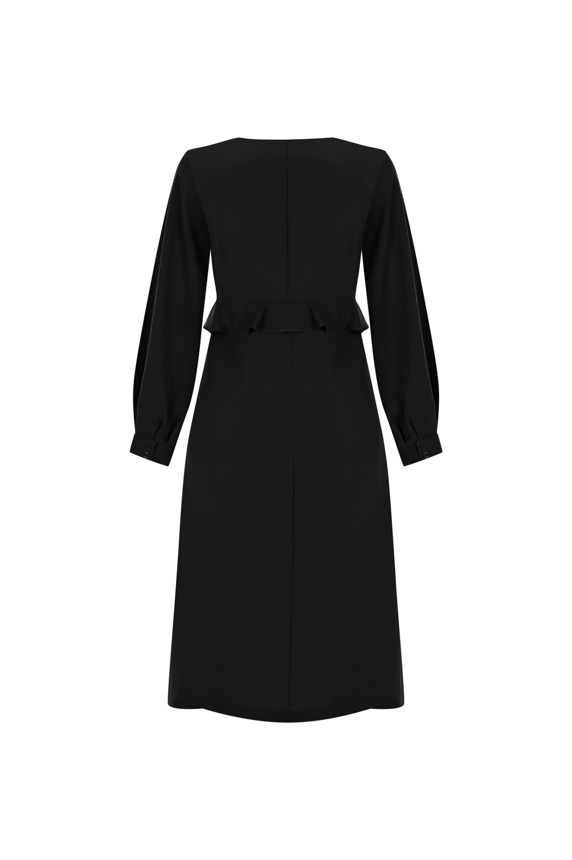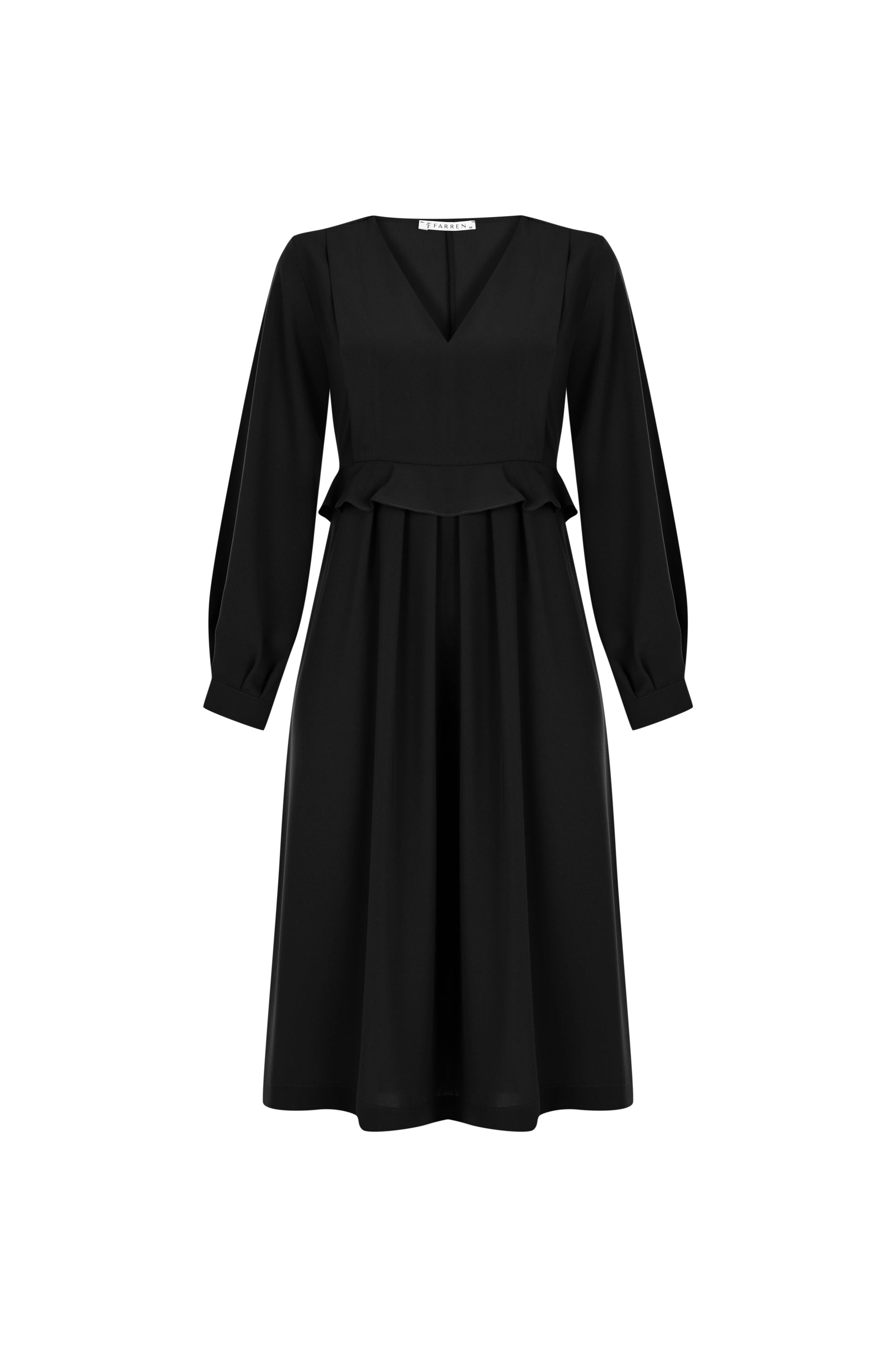 Combining elegance with simplicity, this black midi dress features a chic ruffle detail at the waist and a flattering V-neck. The flared skirt and long sleeves provide both comfort and sophistication, making it a versatile wardrobe staple.
