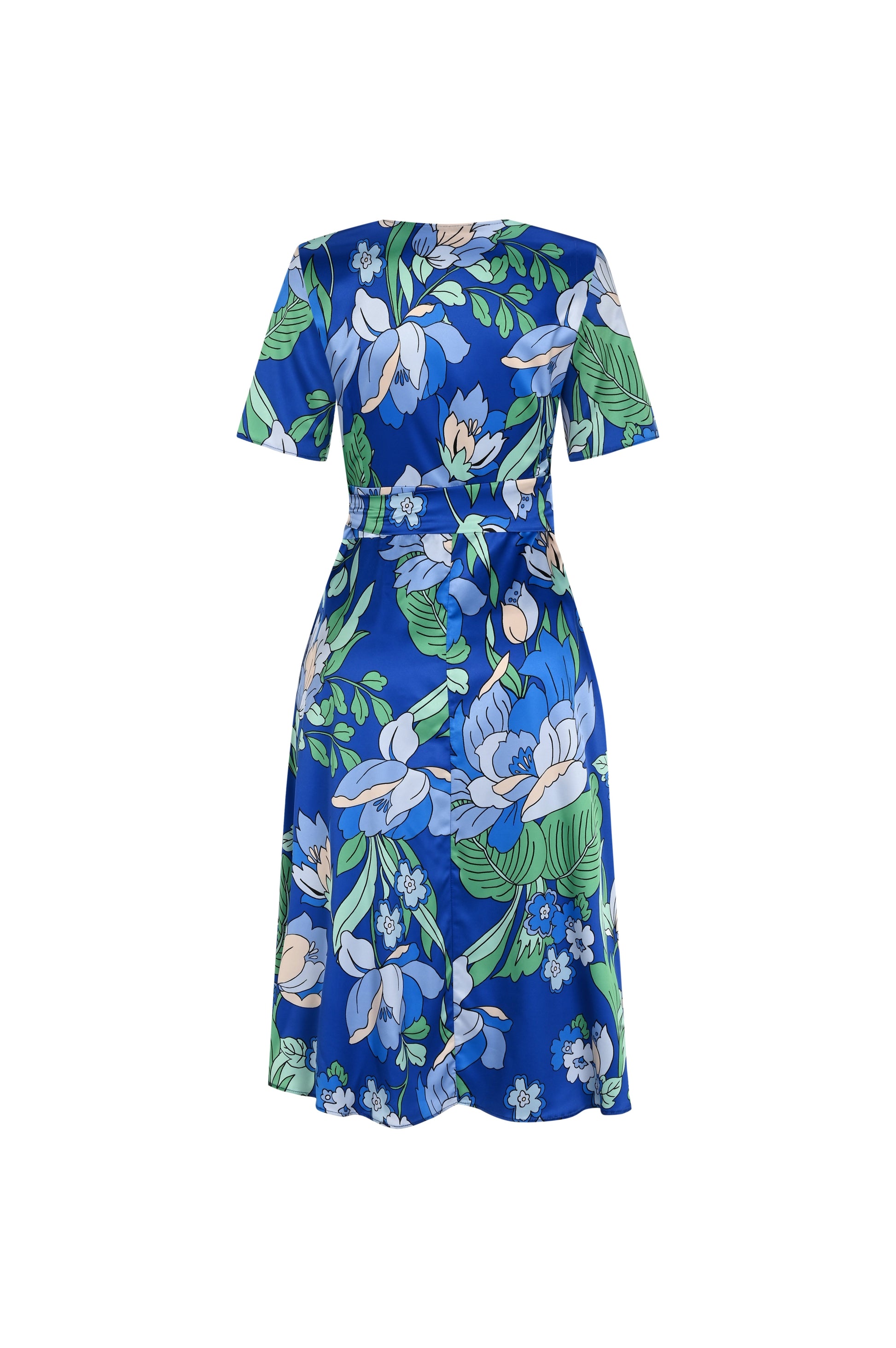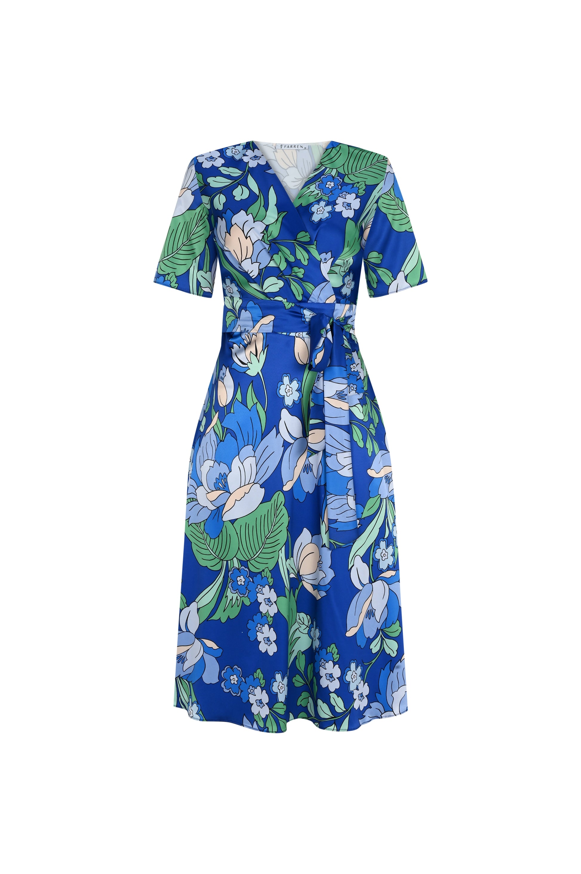 FRN LINE – Blue Bold Floral Print Satin Wrap Dress for Women FRN30383