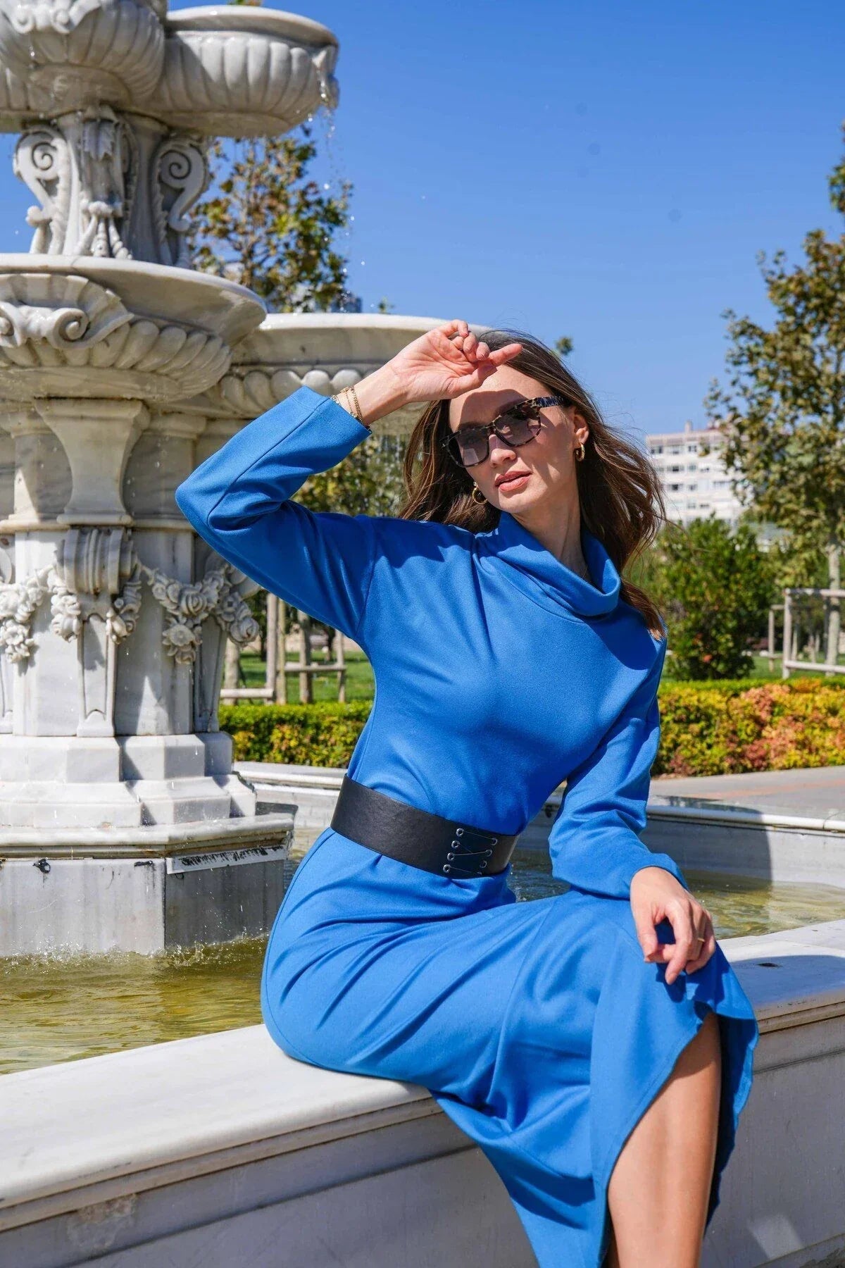 FRN LINE – Blue Knit Dress with Wide Belt and Pleated Panel for Women FRN3135