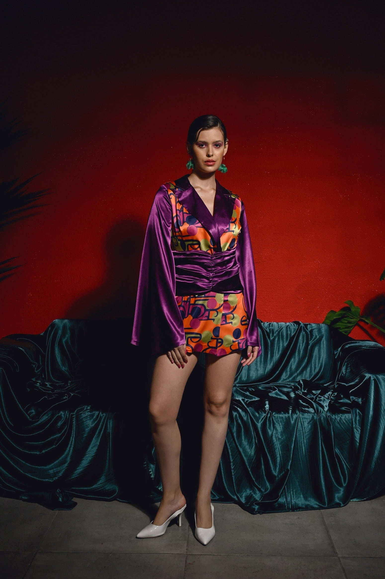 Color & Print | - Sunset Pop: fuchsia, orange, navy, lime abstract geometry - Sleeves & collar: Violet satin |