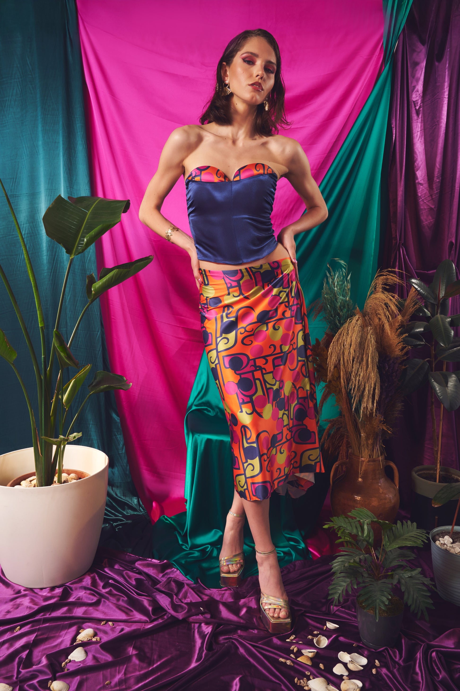 Nox is restraint made radiant. Defined by a midnight navy satin body and a striking pop-art inspired bust detail, this strapless bustier finds elegance in tension. The sweetheart neckline softens the structure, while the sculpted fit shapes the body with quiet assertion.