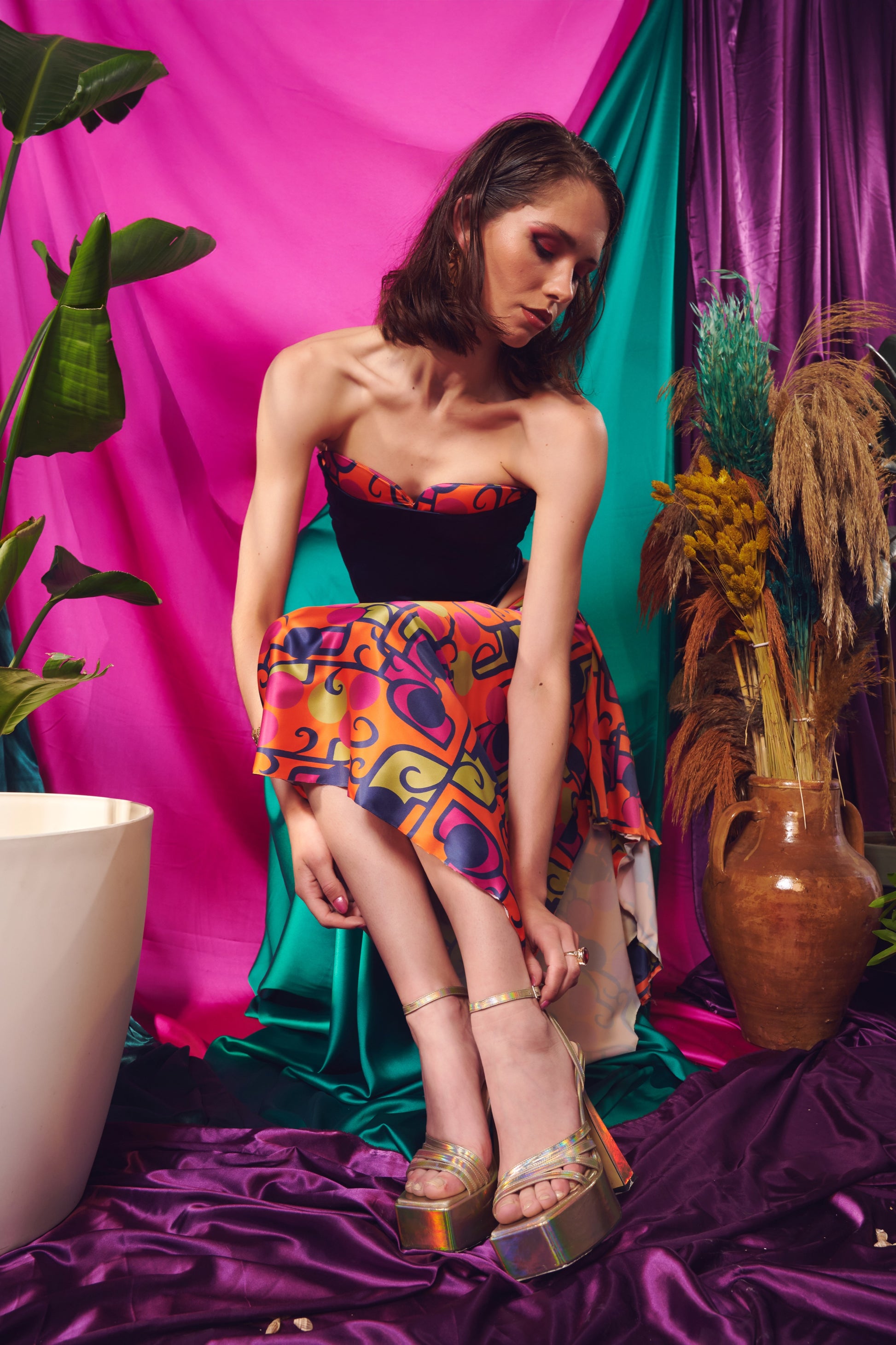 A graphic lining at the bust edge — pulled from FARREN’s Sunset Pop print — adds a discreet but deliberate visual spark. Best worn when the sun fades, and the evening listens.