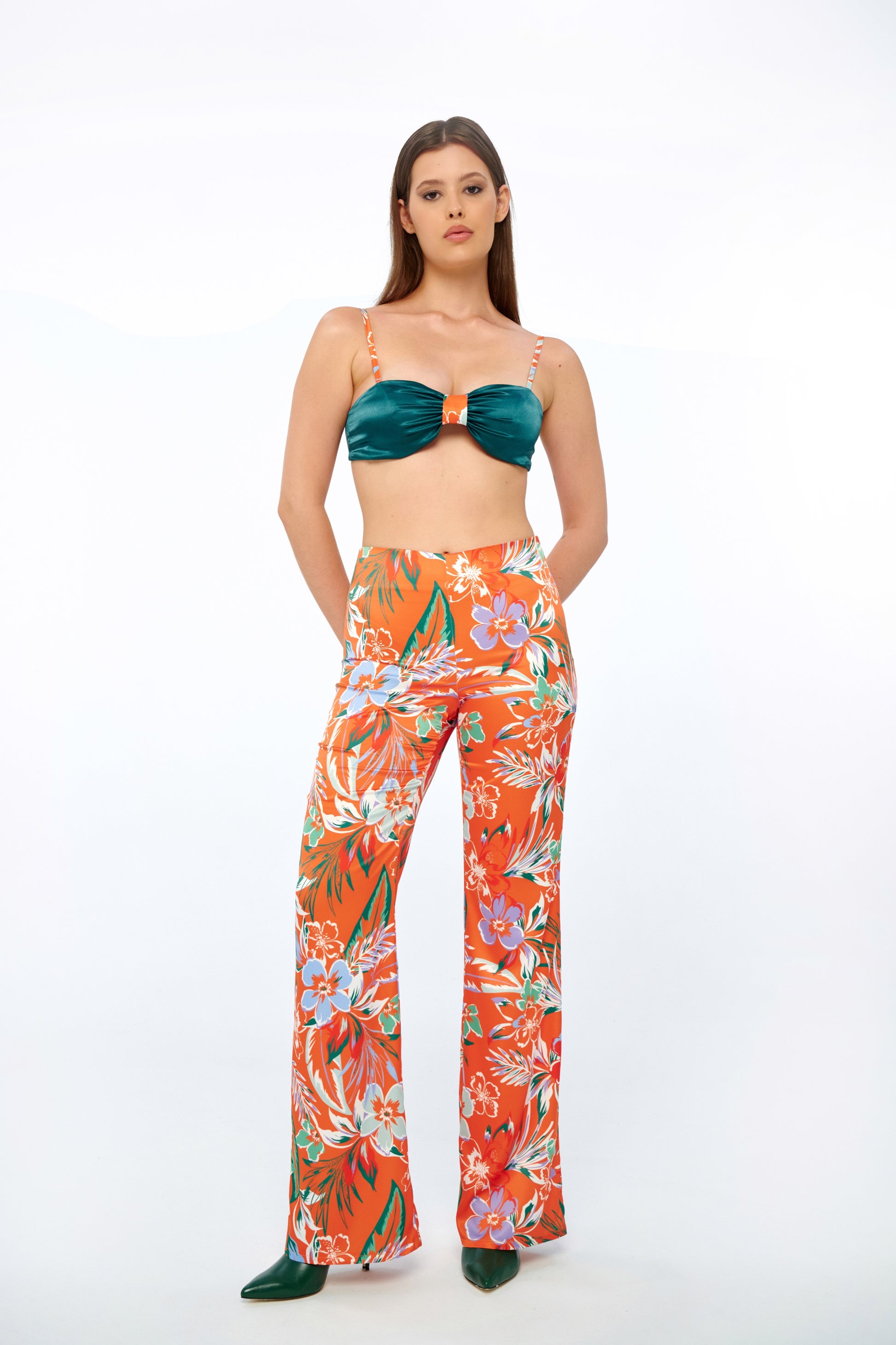 | A sun-soaked palette rendered in motion. Solana is a high-waisted, wide-leg trouser crafted from lightweight satin, printed with a custom tropical motif. The silhouette is cut to elongate the legs, featuring a tailored waistband and subtle flare through the hem. Engineered for resort transitions — from barefoot mornings to curated evenings — this piece offers structural clarity with a relaxed soul. The finish is fluid yet defined, echoing the FARREN rhythm: composed, sensual, and never overstated. Shape follows feeling. Brightness, anchored. |