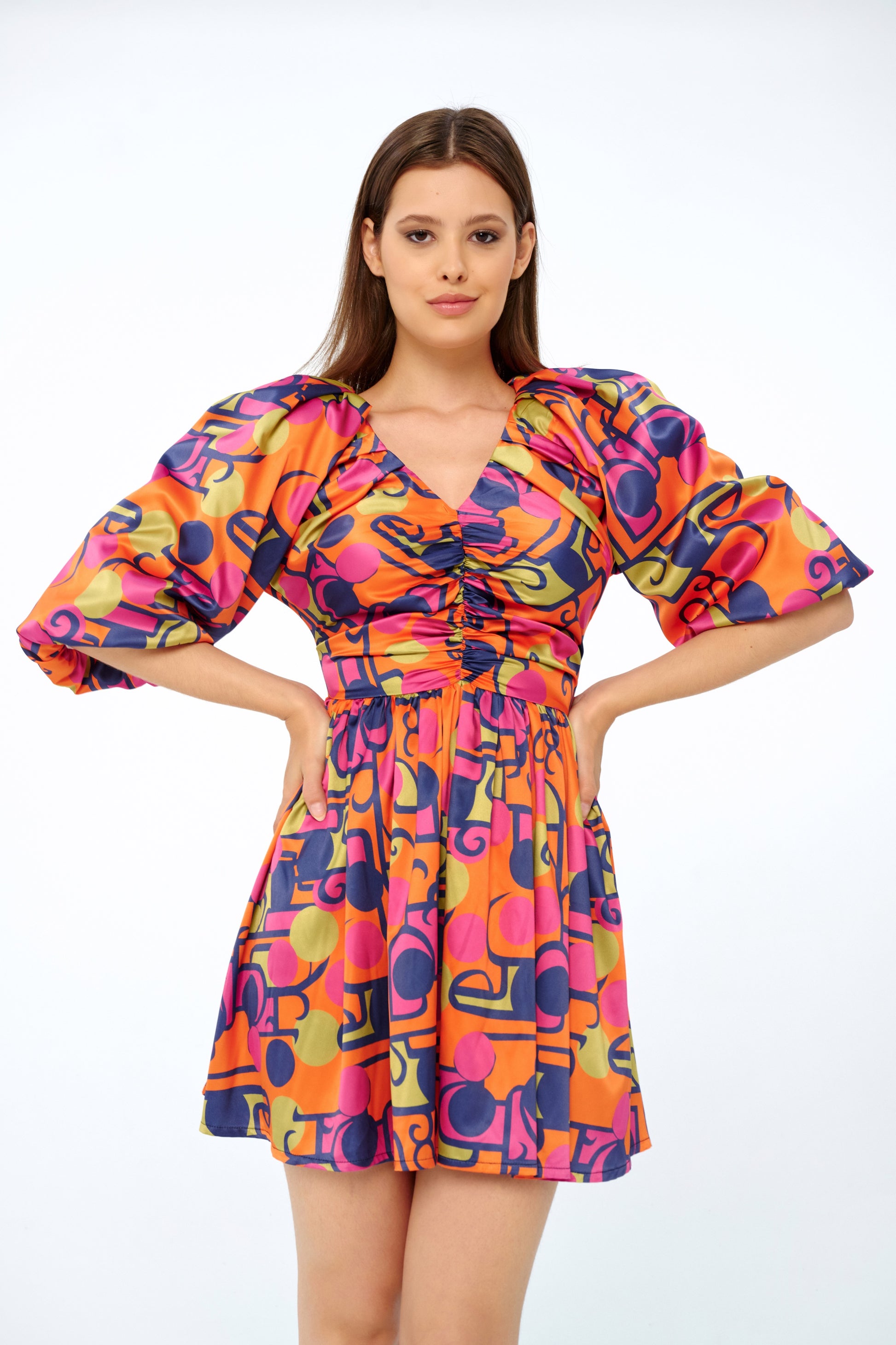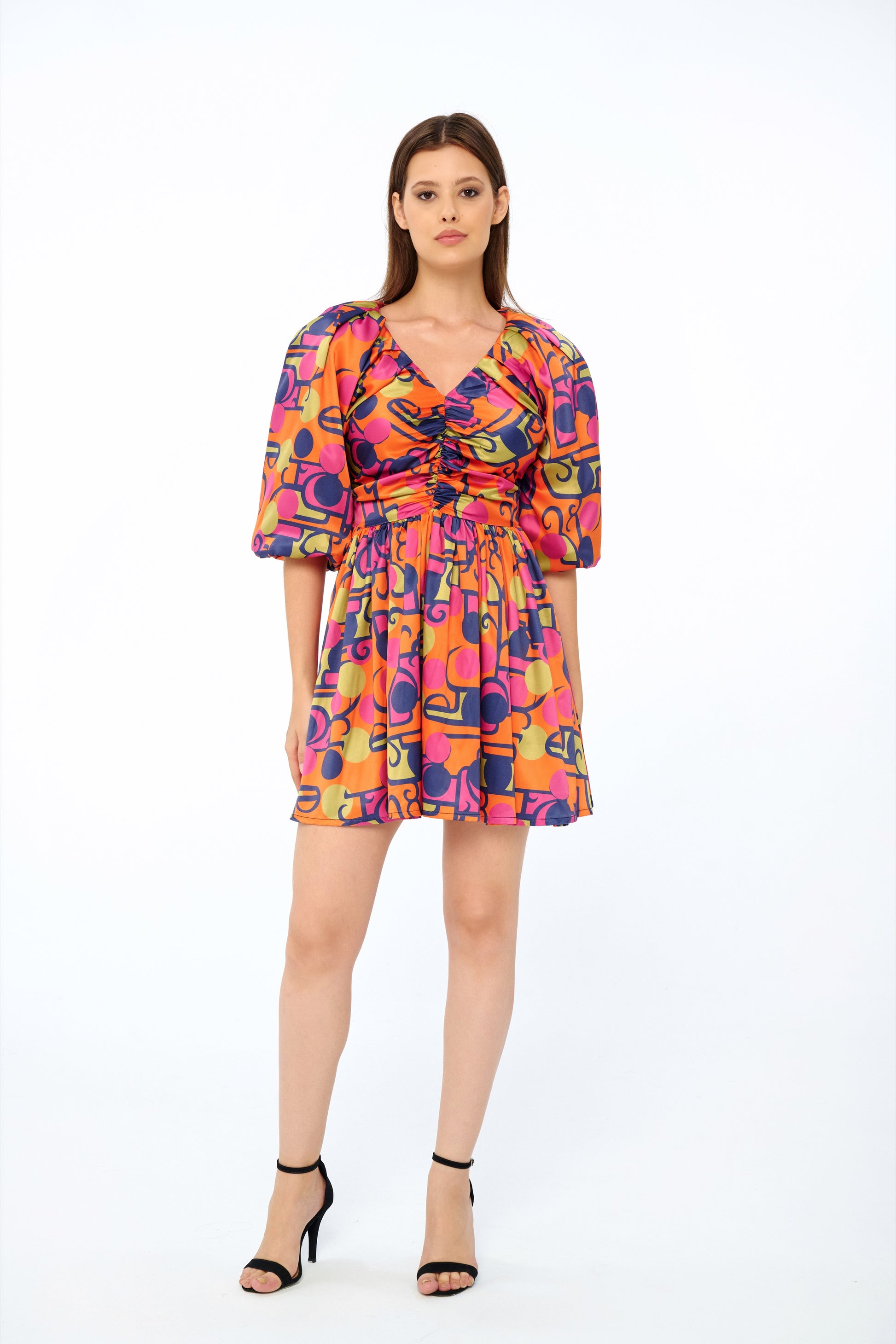 Zoya doesn’t whisper — it hums with rhythm. A bold, bouncy silhouette shaped by volume and pull. This mini dress features a ruched front bodice, V neckline, and architectural puff sleeves that gather into clean elastic cuffs.